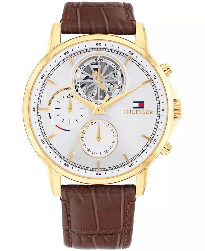 Мужские многофункциональные коричневые кожаные часы 44 мм Tommy Hilfiger, серебро