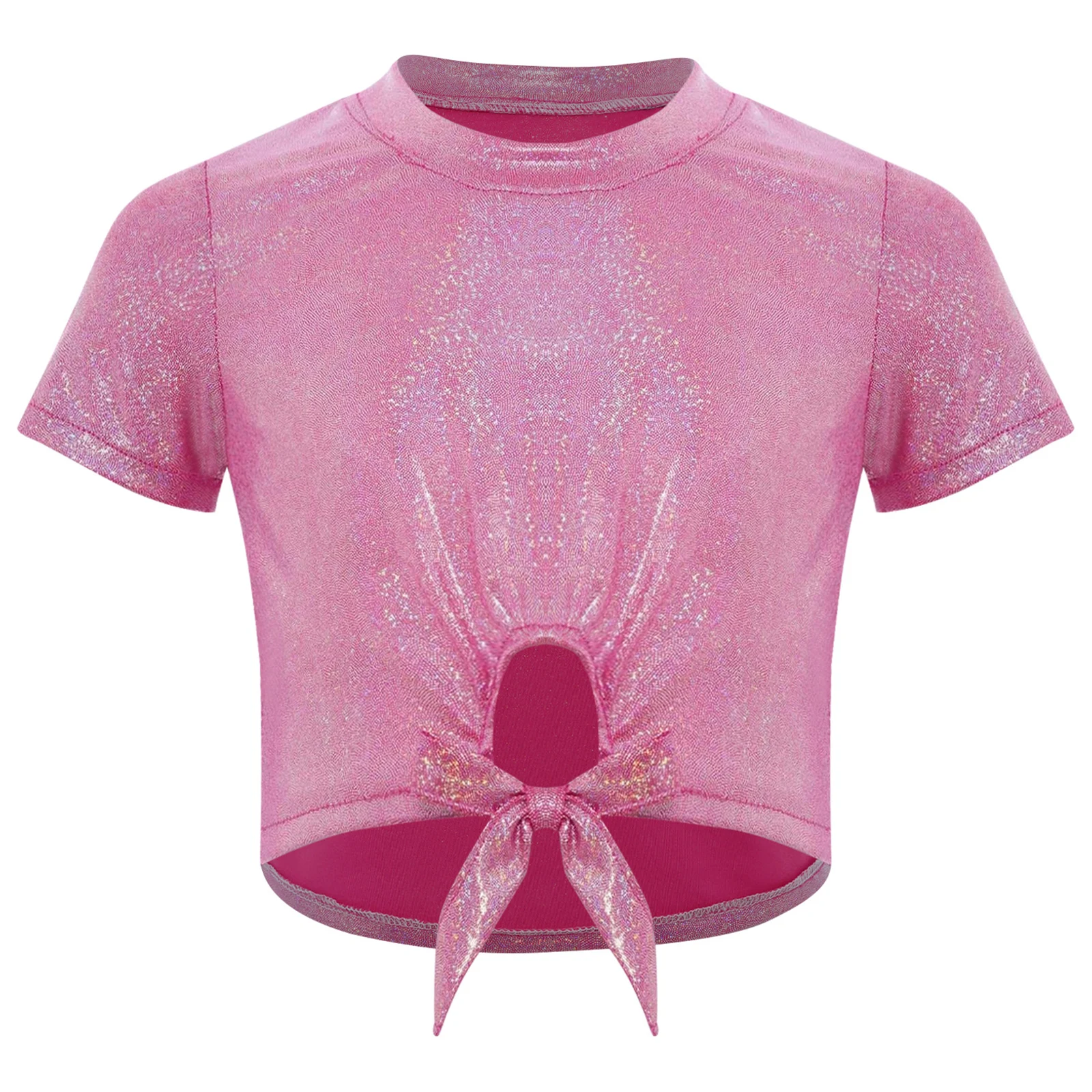 Kids Girls T-shirt Lace-Up Cutout Hem Metallic Round Neck Short Sleeves Crop Top for Cheerleading Jazz Dance Stage Performance