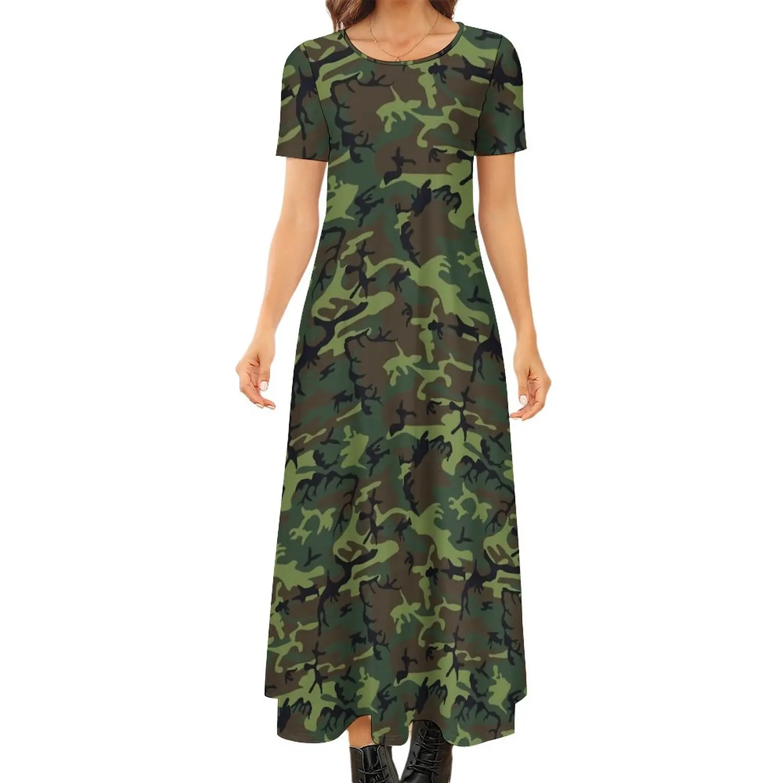 Зеленое камуфляжное платье макси в стиле милитари, современное пляжное длинное уличное платье в стиле бохо с коротким рукавом, большие размеры