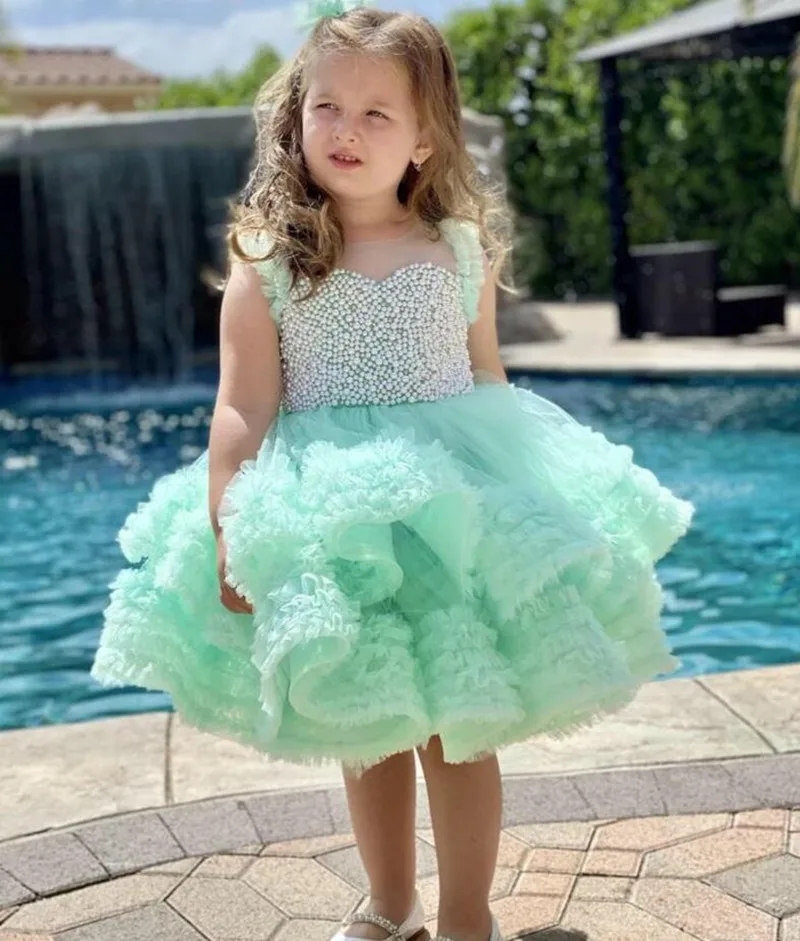 Зеленое платье принцессы с бусинами и жемчугом, пышное платье для первого причастия, платья для девочек с цветами, милое детское платье для девочек на первый день рождения