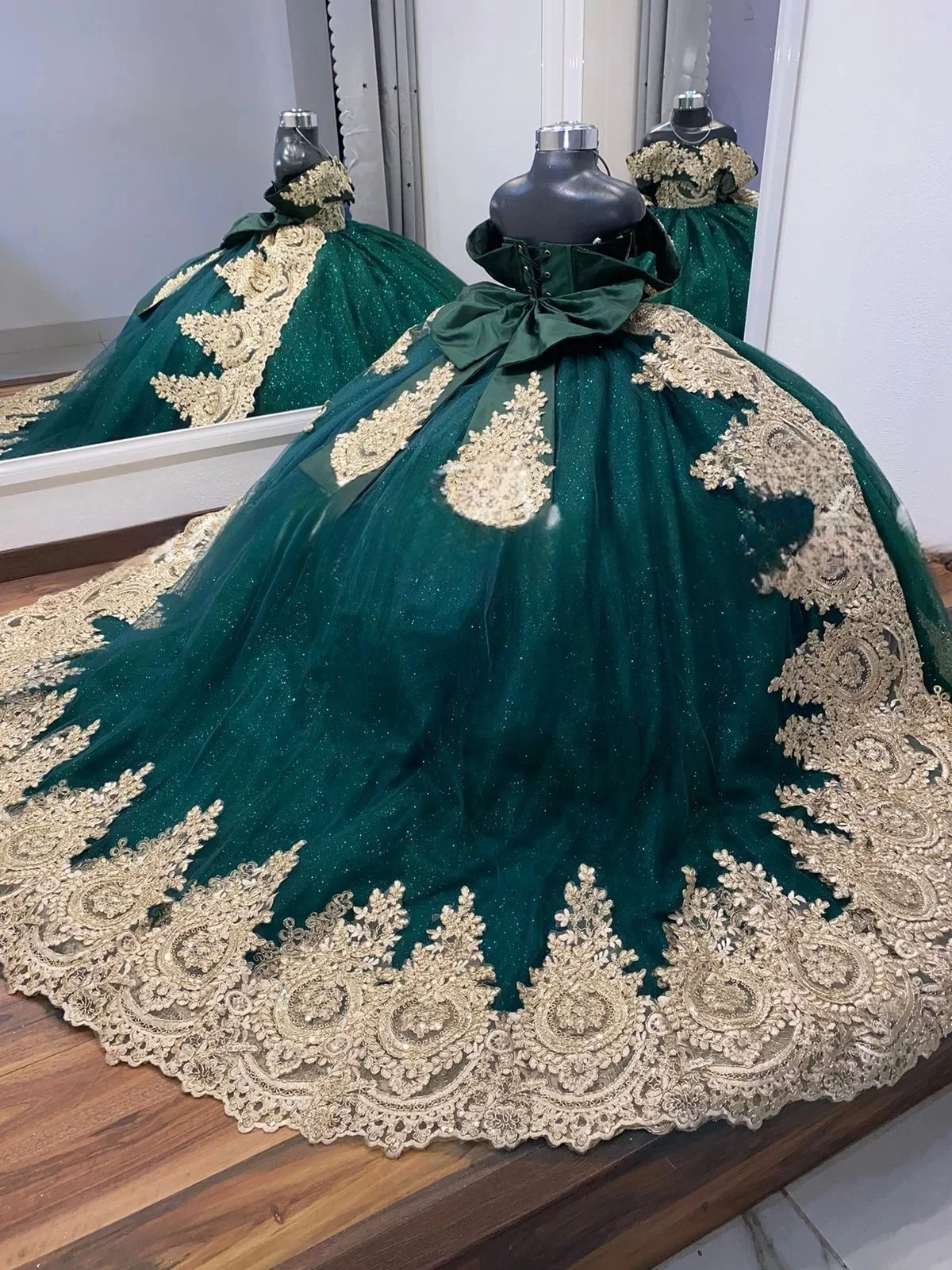 Зеленое праздничное платье для детей, платье с цветочным узором для девочек с золотой аппликацией на свадьбу, бальные платья с открытыми плечами для дня рождения