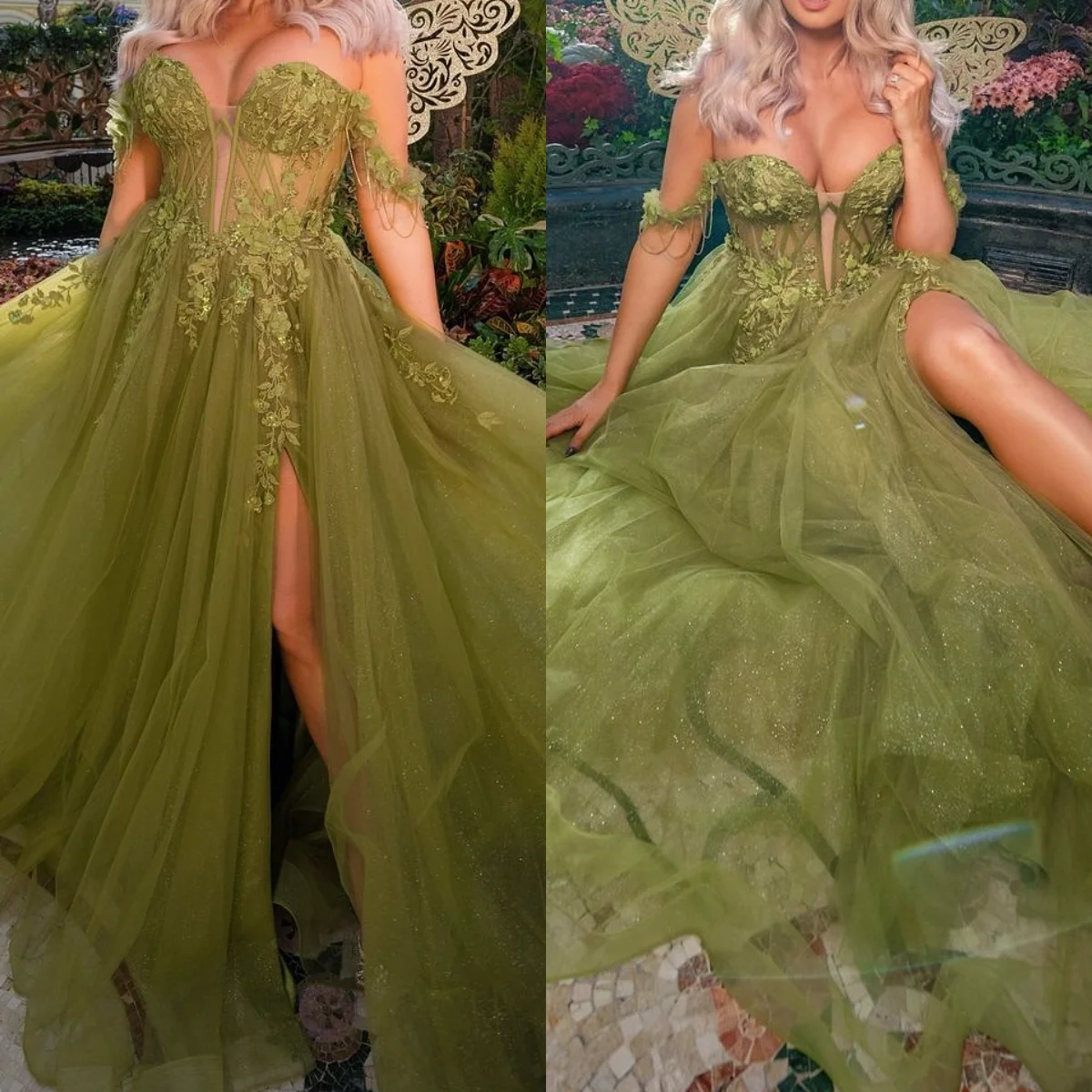 Зеленые платья для выпускного вечера с открытыми плечами, блестящие вечерние платья из тюля с разрезом по бокам, индивидуальные платья с аппликацией из бисера, платья de noche