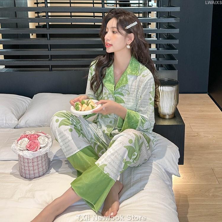Зеленый Цветок Свободный Пижамный Костюм Новая Весна Осень Отворот Домашняя Одежда Печатный Удобный Корейский Стиль Ins Женский Комплект XL