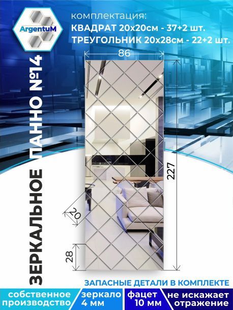 Зеркальное панно из Квадратов 20х20 см с фацетом 10мм (86х227 см), panel20020002arg