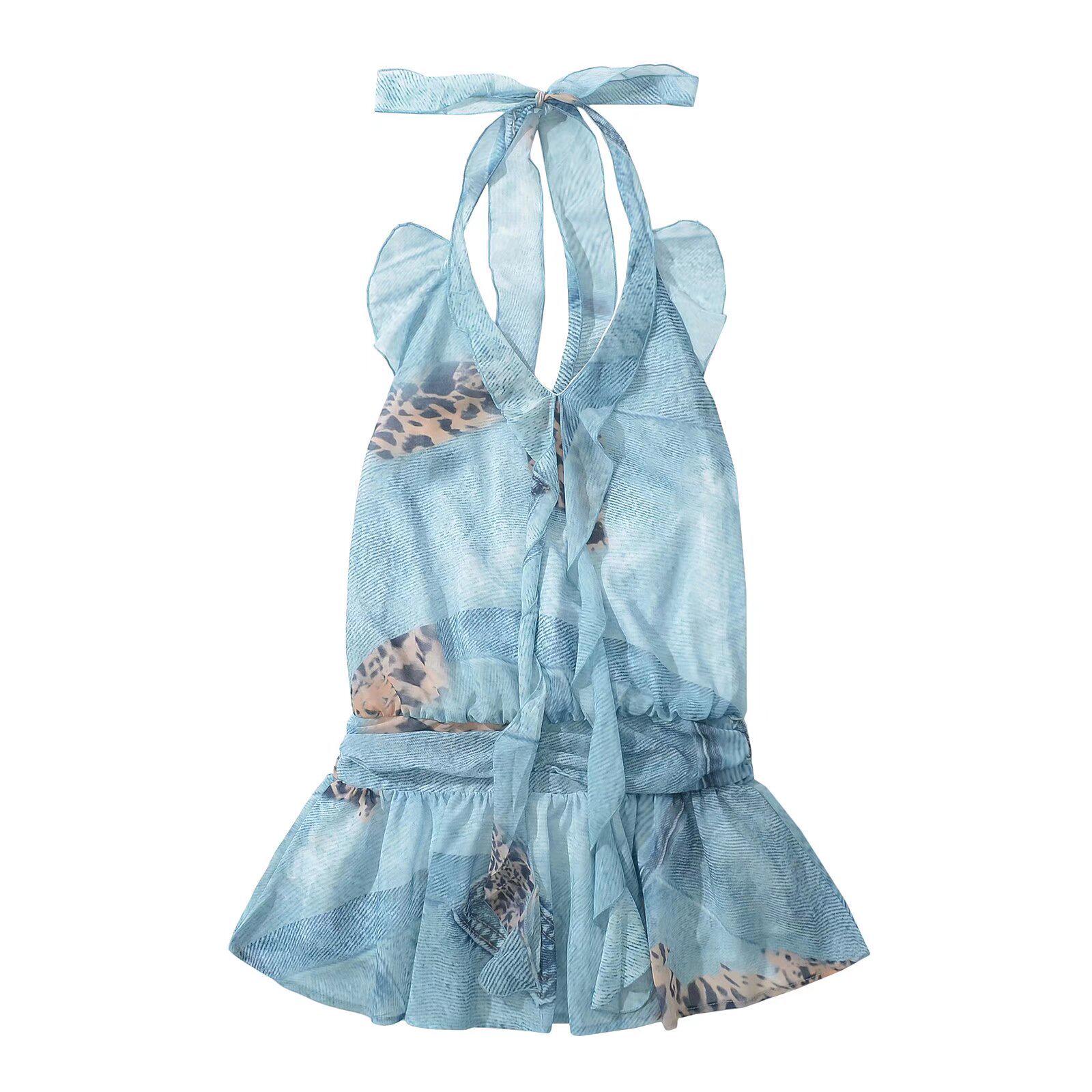 Зима 2024 Женское платье в европейском и американском стиле с халтером, оборками и принтом, со сборками на талии Medium синий