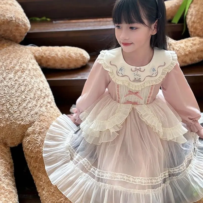 Зимнее бальное платье принцессы Лолиты в испанском стиле для девочек, розовое бальное платье с вышивкой и бантом, милые сетчатые платья на день рождения, Пасху и Ид
