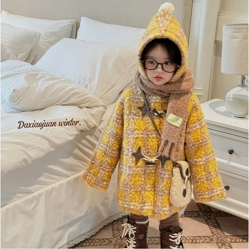 Зимнее детское плюшевое пальто, бархатное пальто с капюшоном в стиле ретро, утепленная теплая верхняя одежда в клетку из овечьего флиса для маленьких девочек средней длины