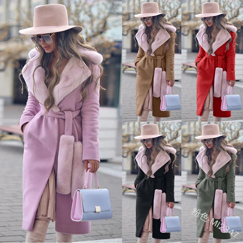 Зимнее женское пальто S-5XL, повседневное шерстяное Женское пальто с отложным воротником и поясом, модная теплая однотонная Длинная Верхняя о...