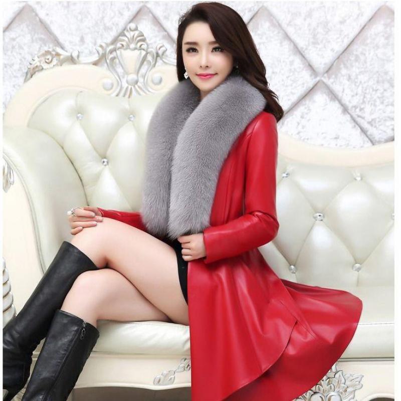 Зимнее тонкое модное женское кожаное пальто средней длины с меховым воротником, утепленная ветровка, женские кожаные куртки и пальто