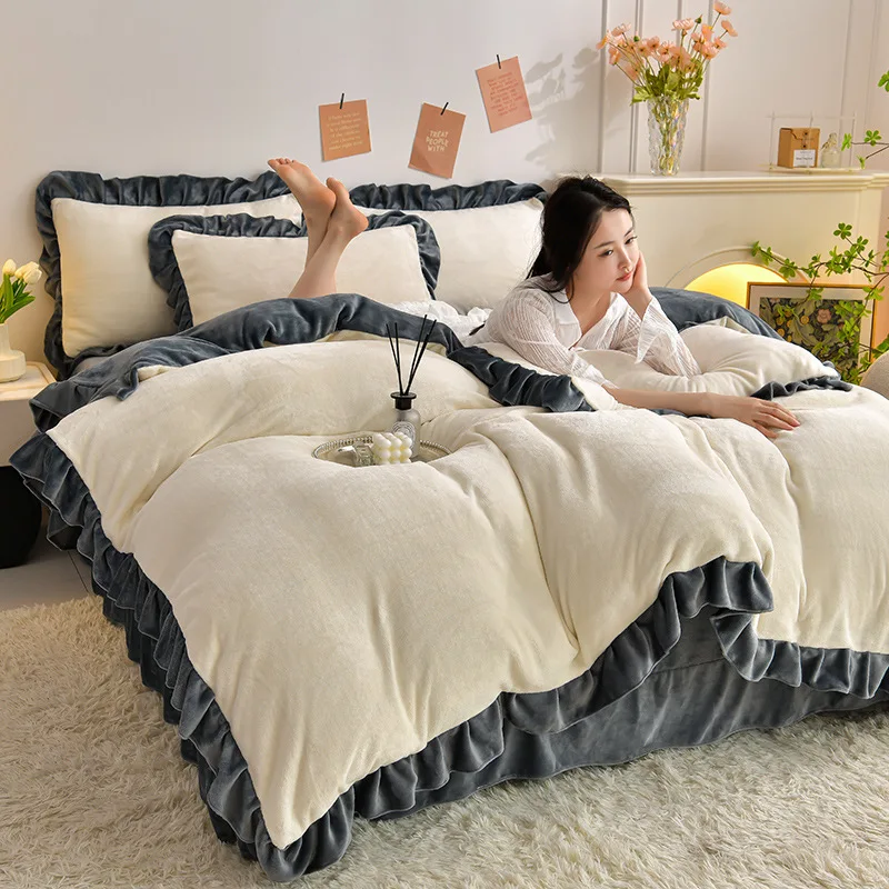 Зимнее утолщенное теплое двухстороннее плюшевое роскошное постельное белье, искусственное одеяло, покрывало, простыня, наволочка, Комплект постельного белья из 4 предметов для двуспальной кровати