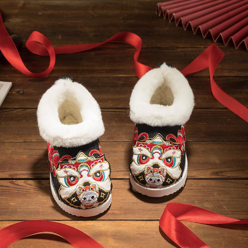 Зимние бархатные туфли с вышивкой для девочек, низкие хлопковые туфли с изображением льва и кролика, теплые туфли ханьфу, зимние сапоги для девочек, большие хлопковые сапоги 36 чёрный
