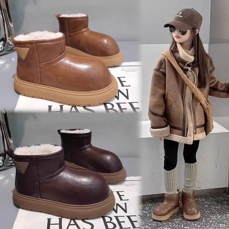Зимние ботильоны до щиколотки 2025 года, зимняя теплая детская обувь на меху, новые кожаные ботинки на плоской подошве на платформе, повседневная плюшевая хлопковая обувь, ботинки челси