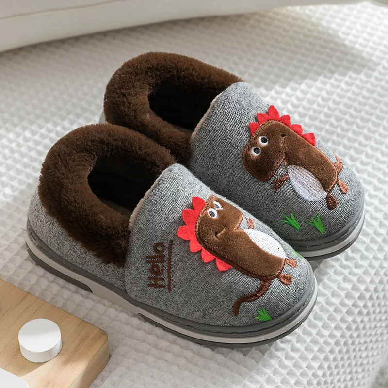 Зимние детские тапочки с динозавром для мальчиков и девочек, хлопковая обувь, мягкие Нескользящие Детские домашние тапочки, детская теплая ...