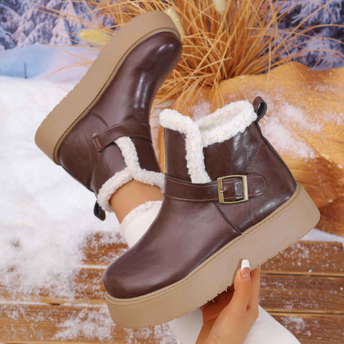 Зимние женские водонепроницаемые пуховые сапоги на толстой подошве 2025 с металлической пряжкой, массивной платформой и меховой отделкой до щиколотки, теплая плюшевая повседневная обувь 43 коричневый