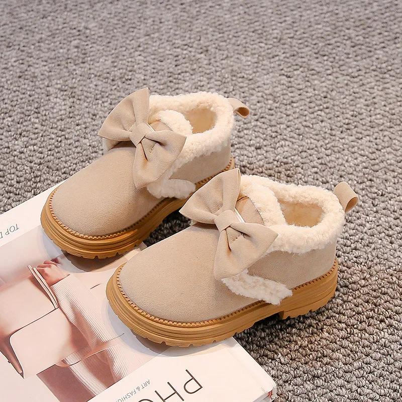 Зимние сапоги для девочек с большим бантом, детские сапоги принцессы, нескользящие, на липучке, 2024, зимние новые модные теплые сапоги для девочек, милые, элегантные 23 бежевый