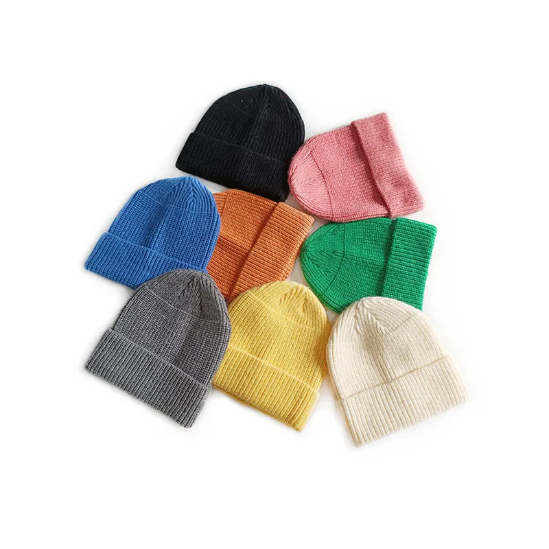 Зимние шапки для маленьких девочек и мальчиков, вязаные облегающие шапки с манжетами, мягкая теплая Модная однотонная Осенняя вязаная шапочка, Детские повседневные облегающие шапки