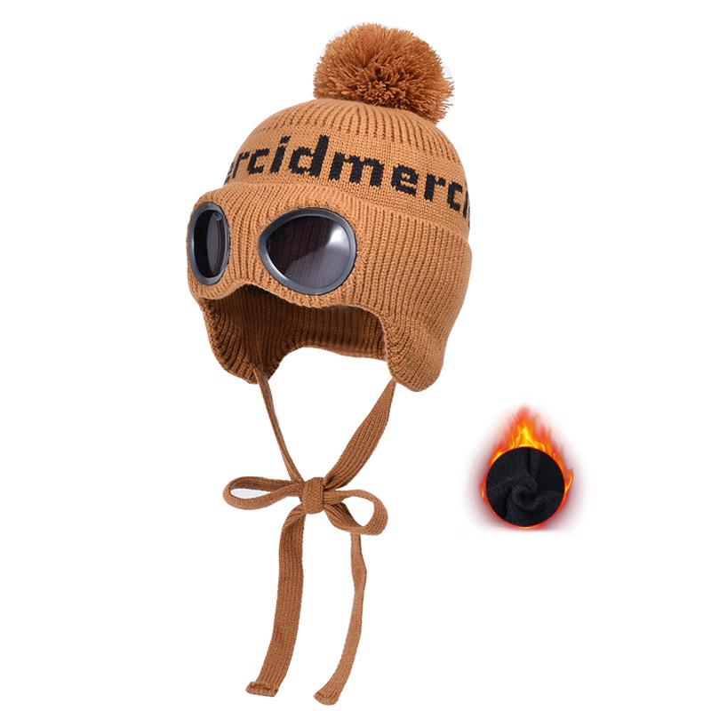 Зимние шапки Skullies с очками, женская вязаная шерстяная шапка с буквами и меховыми шариками, для улицы, теплая, для защиты ушей, для защиты рук верблюд