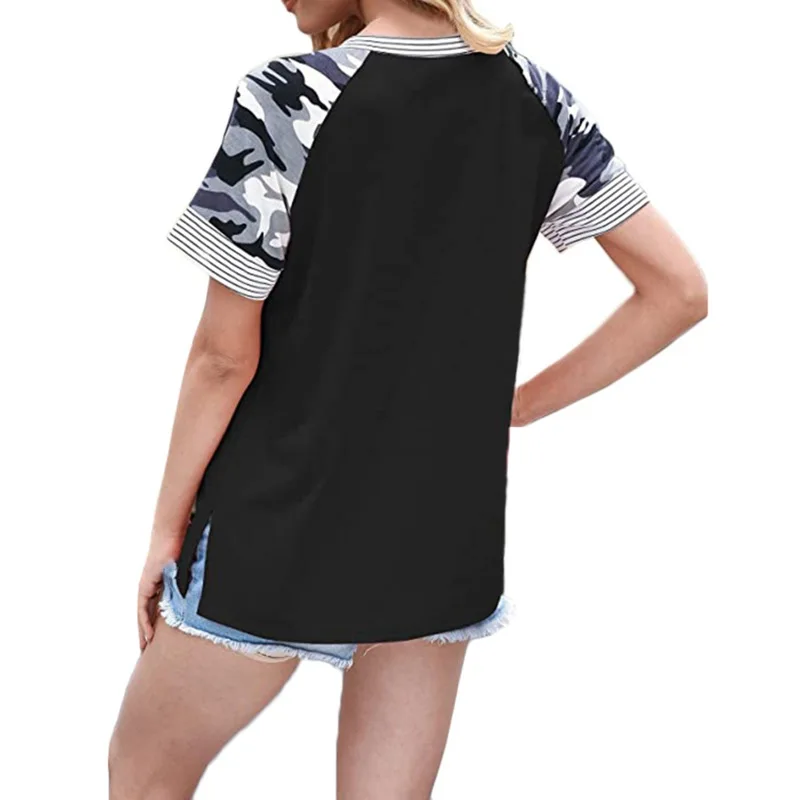 Women Summer Retro Print Patchwork T-Shirts O Neck Striped Short Sleeve Loose Pullovers Top