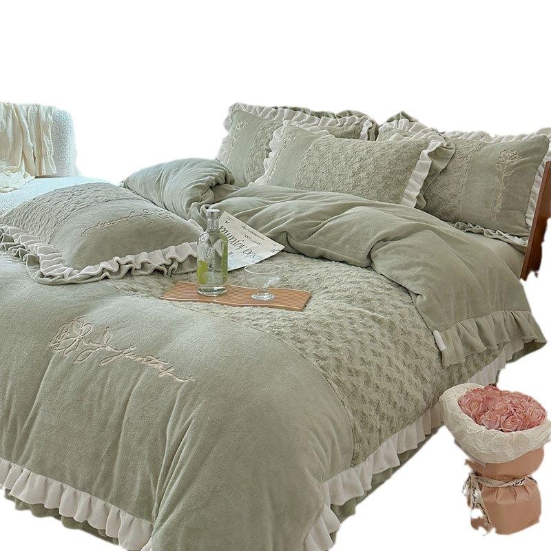 Зимний утолщенный и теплый комплект из четырех предметов из кроличьего бархата и молочного бархата с вышивкой и кружевным розовым пододеяльником, однотонное постельное белье
