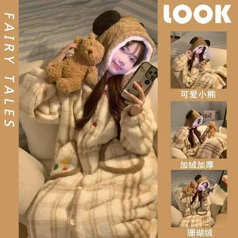 Зимний халат для девочек, милые пижамы с капюшоном, утепленная одежда для сна из кораллового флиса, ночная рубашка с героями мультфильмов, домашняя одежда на флисовой подкладке, халат