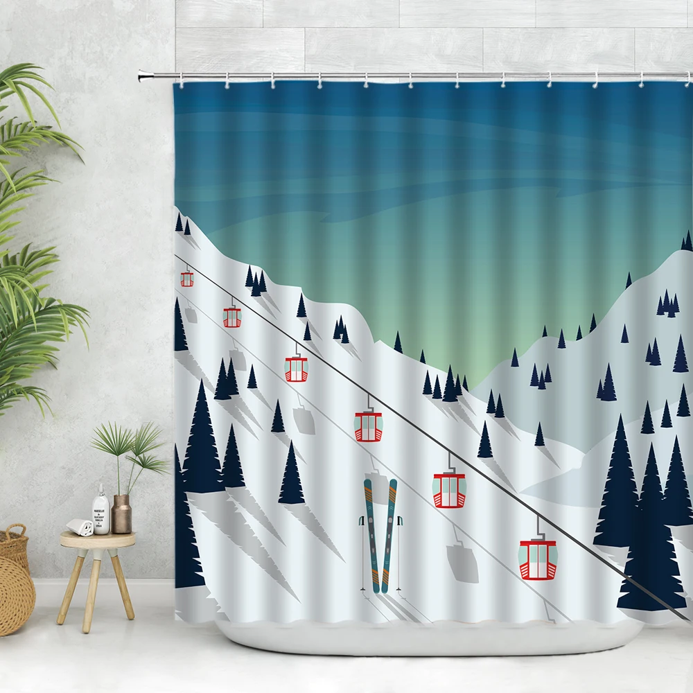 Зимняя Снежная гора душевая занавеска дерево природный пейзаж кабель Автомобиль лыжное поле иллюстрация Мультяшные занавески декор для ванной наборы