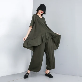 Women TWO PIECE SET Irregular Top Ruffle X Long Blouse T Shirts Elegant Vintage Loose Wide Leg Pants Summer Outfits Survetted pc