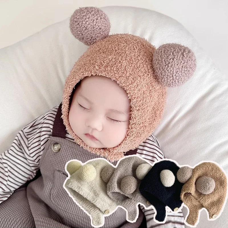 Зимняя детская шапка для защиты ушей, милая плюшевая шапка с двойным шариком для младенцев, флисовая шапка из ягненка, детские наушники, шапка для детей от 3 до 24 месяцев, теплый чепчик для мальчиков и девочек