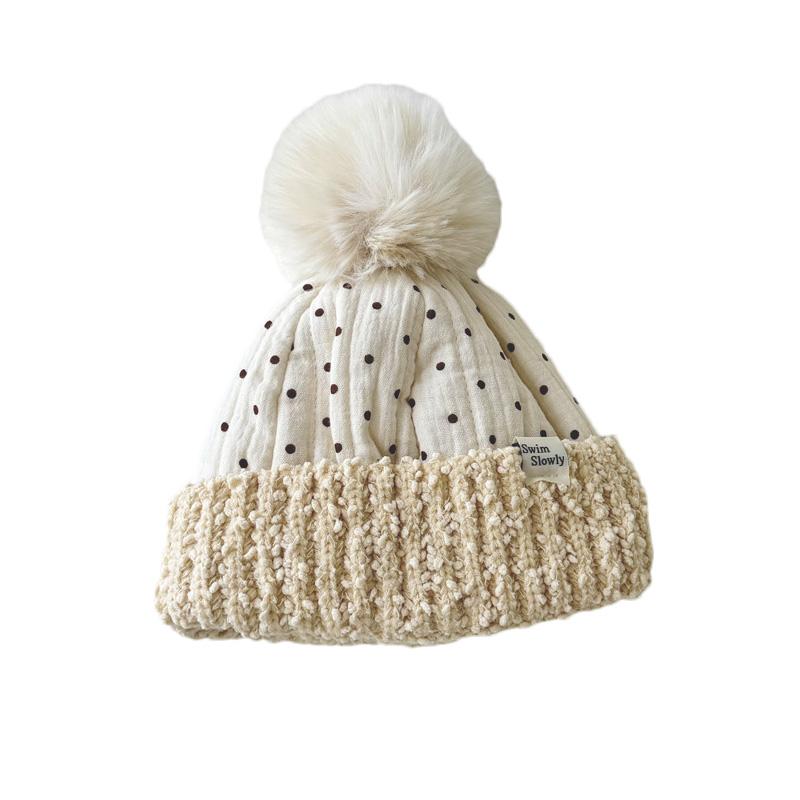 Зимняя детская шапка с милым помпоном в горошек для мальчиков и девочек, вязаные шапки, защита ушей, чепчик для малышей, теплые детские аксессуары 0-3 лет 40-48cm бежевый