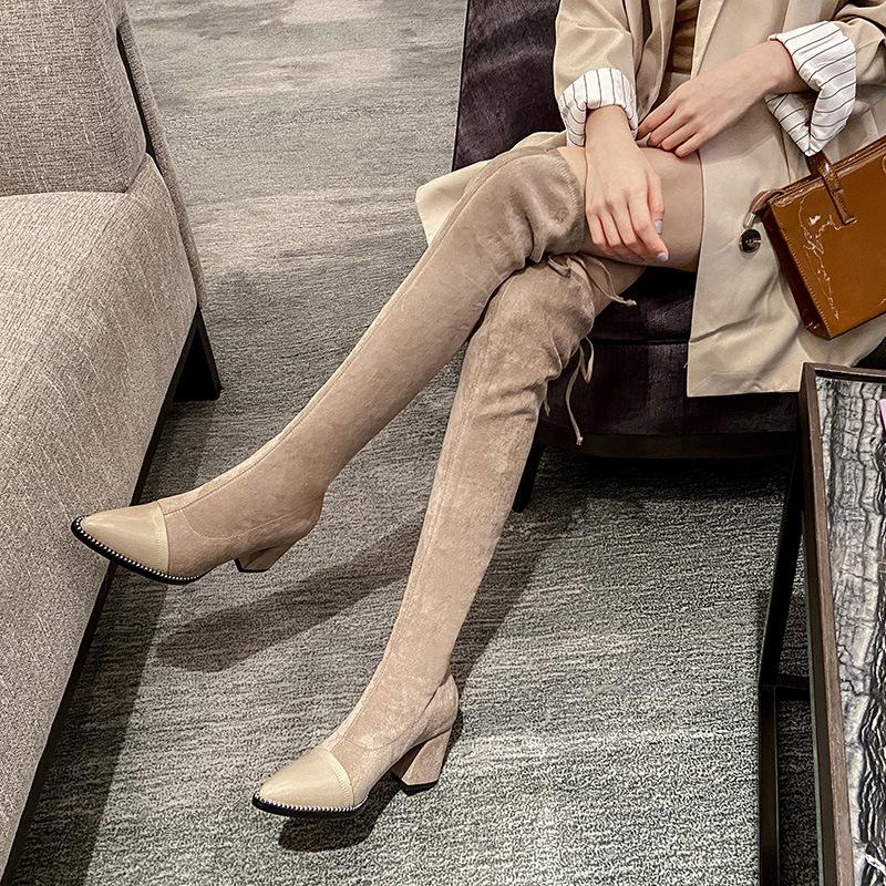 Зимняя женская обувь Женские сапоги Сапоги выше колена Эластичные сапоги на высоком каблуке Толстый каблук с острым носком Плюс Бархатные сапоги выше колена Женские