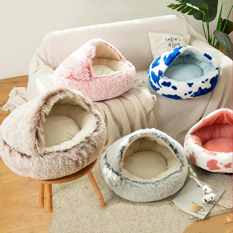 Зимняя кровать для кошек 2 в 1 круглая теплая кровать для домашних животных Дом Длинная плюшевая кровать для собак Теплый спальный мешок Диван Подушка Гнездо для маленьких собак кошек