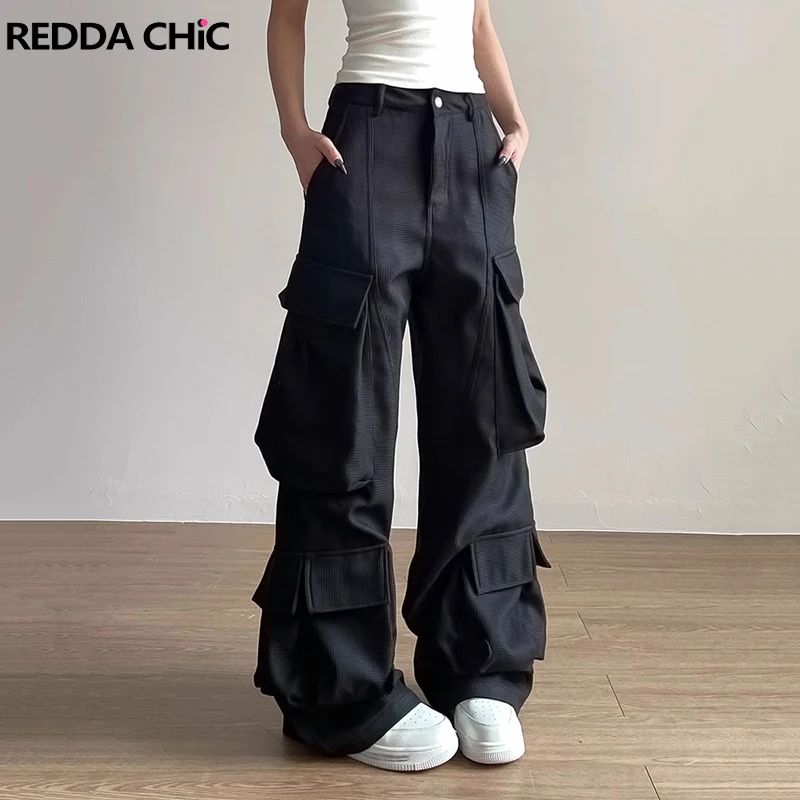 REDDACHiC Grunge Black Cargo Pants for Women Militarily Multi-pocket Wide Leg Patchwork Baggy Jeans Big Size Hip Hop Streetwear