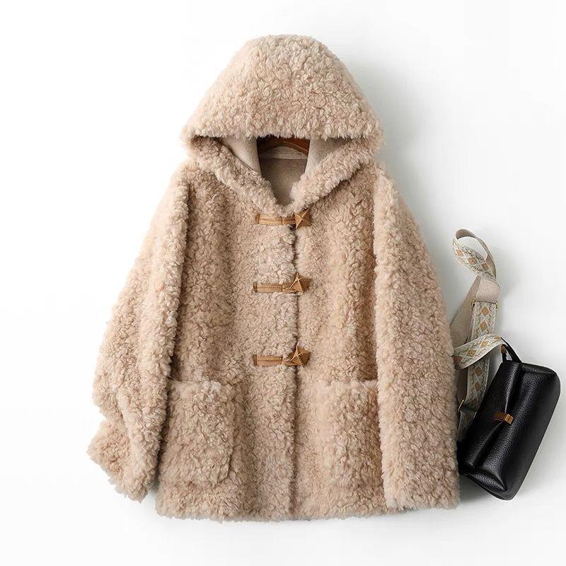 Зимняя новая шуба из ягненка, шуба женская, свободная, короткая, с капюшоном, шуба из овечьей шерсти, утолщенная S within 59 kg