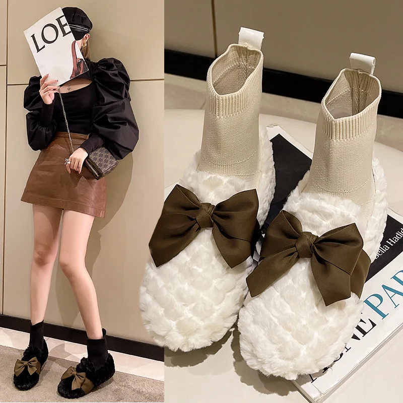 Зимняя обувь для женщин, уличная простая замшевая хлопковая обувь с бантом, удобная милая мягкая Нескользящая легкая женская обувь на плоск...