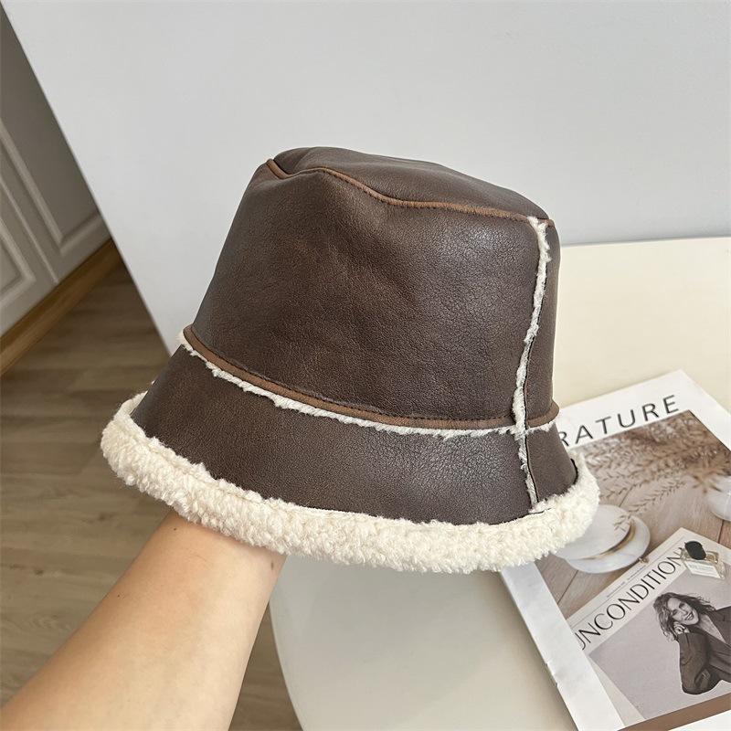 Зимняя ретро вымытая ПУ кожа шляпа-ведро с плоским верхом женская бархатная внутренняя теплая ветрозащитная модная шляпа-котелок M(56-58cm)