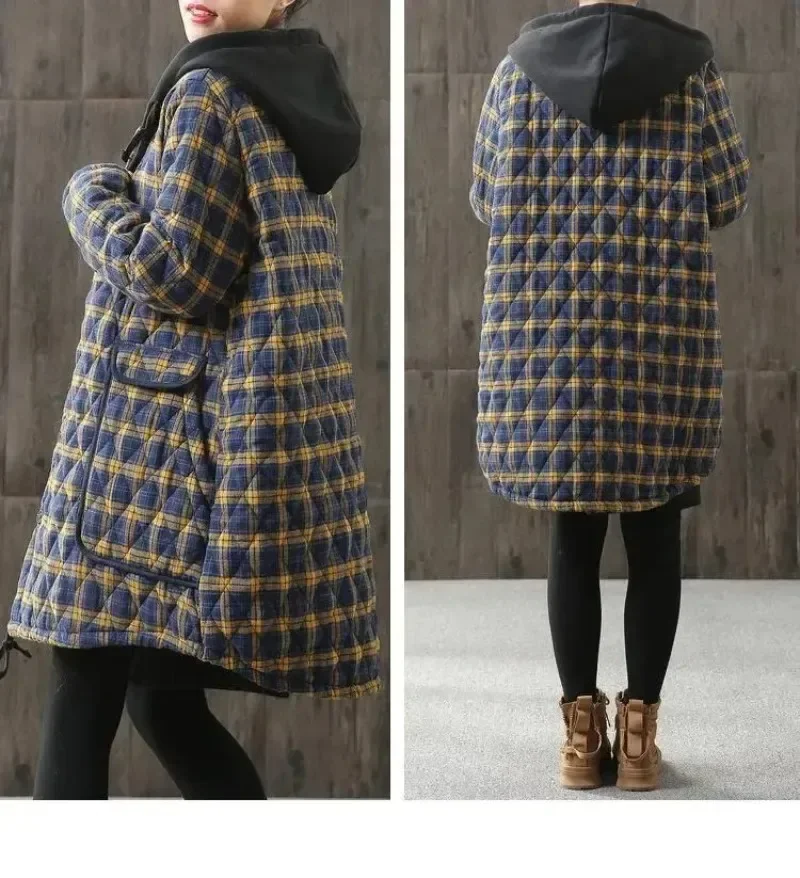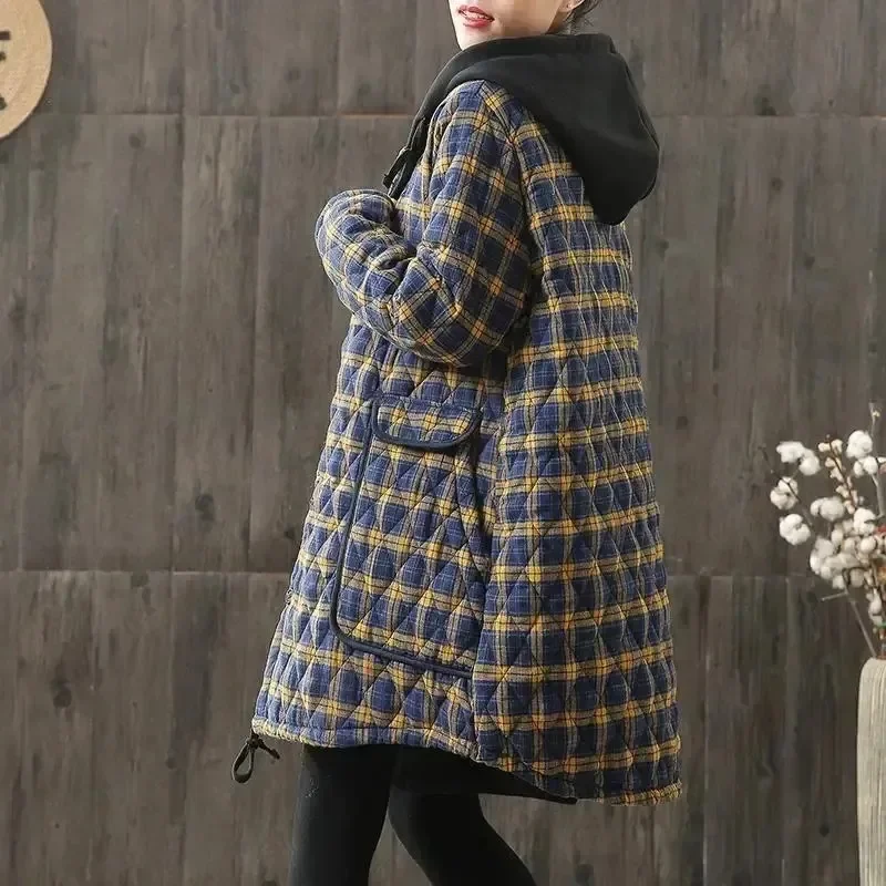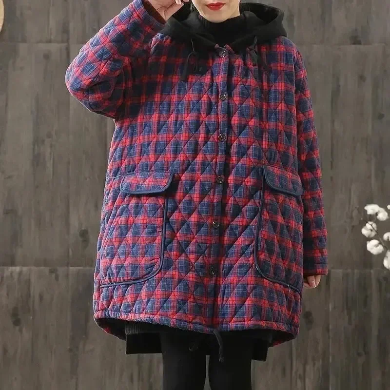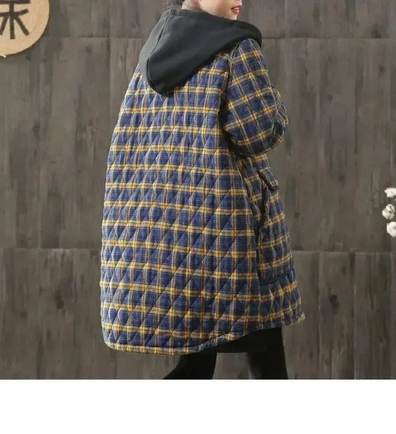 Зимняя свободная толстая стеганая хлопковая ткань в стиле ретро, одежда большого размера с хлопковой подкладкой, женская хлопково-льняная клетчатая одежда со средней длины, пальто