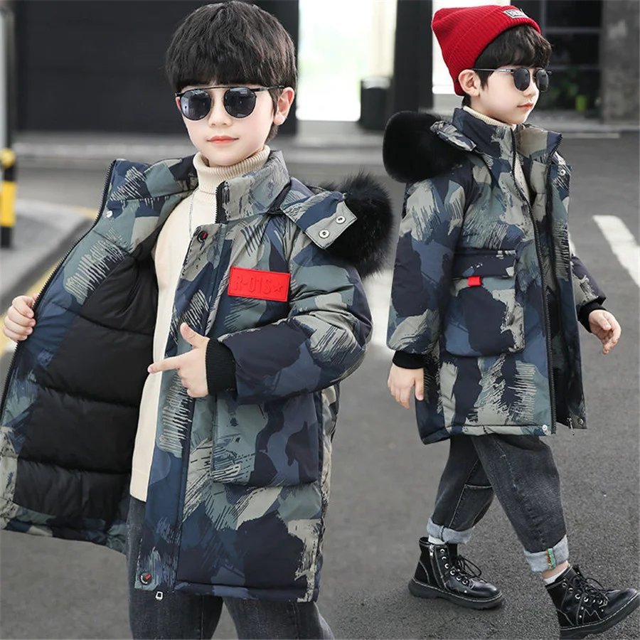 Зимняя теплая куртка От 4 до 12 лет, парки, Детская пуховая Повседневная теплая куртка с капюшоном для мальчиков, большие меховые пальто, детс...