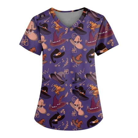 Bazyrey Halloween Scrub tops for Women Fashion Casual Short Sleeve V-Neck Halloween Printed Pocket Top Purple 4XL