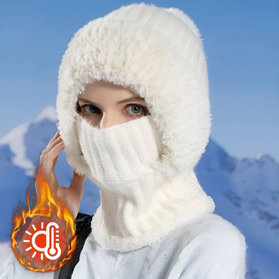 Зимняя теплая шапка, женская толстая вязаная защита ушей с маской для лица, шарфом и пушистой шапкой, подходящие ветрозащитные толстые плюшевые шапочки