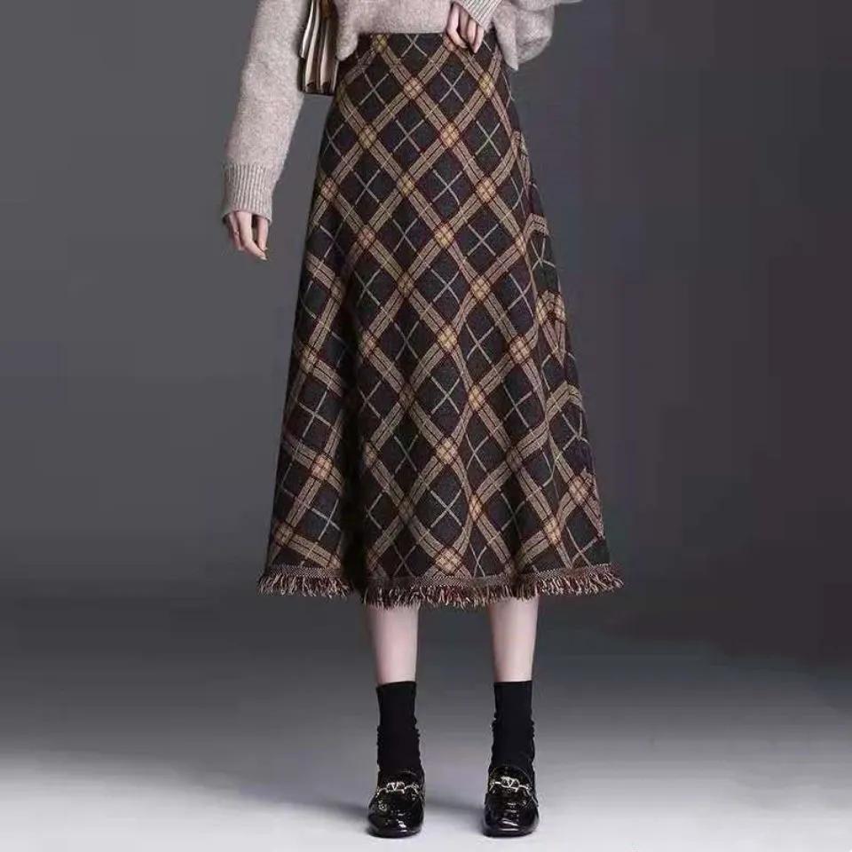 Зимняя трикотажная юбка-трапеция с кисточками, длинная юбка в клетку с принтом C, женская осенняя юбка с эластичной талией и высокой талией, теплая юбка, элегантная офисная женская юбка Saia S кофейный