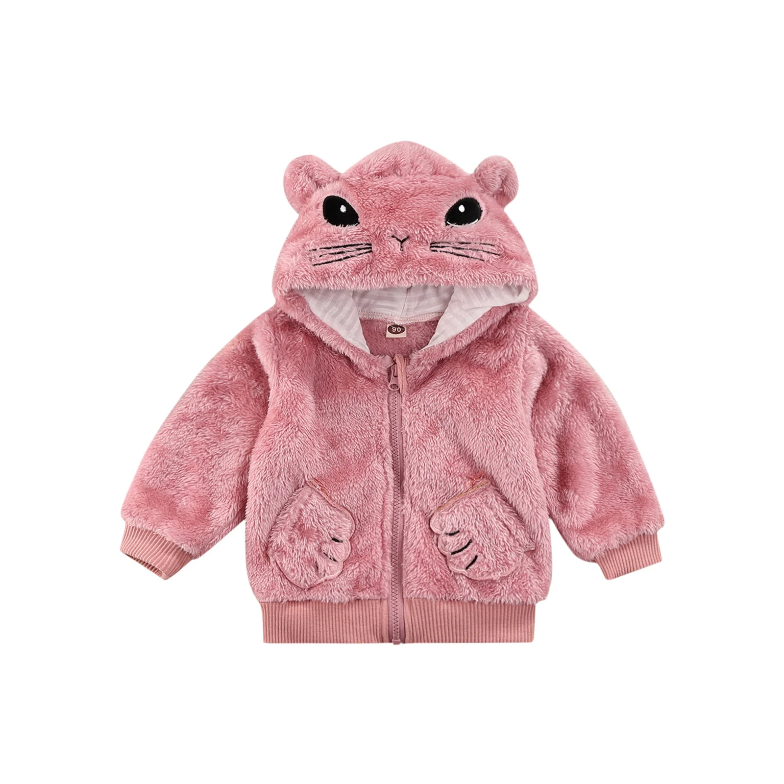 Зимняя флисовая однотонная верхняя одежда с длинным рукавом для маленьких девочек, с мультяшной вышивкой и 3D ушками, теплое пальто с капюшо...