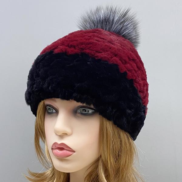 Зимняя шапка женская с помпоном теплая из натурального кроличьего меха рекс шапка толстой вязки классическая популярная женская стильная вязаная шапка One Size винный