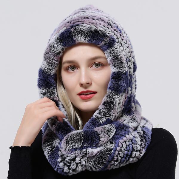 Зимняя шапка-капюшон вязаная из меха кролика рекс многоцветная головной убор женская теплая меховая шапка One Size