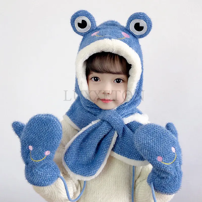 Зимняя шапка, шарф, перчатки, детская зимняя теплая шерстяная шапка для мальчиков и девочек, шапка в виде милой лягушки, шарф, шапочки и шапоч...