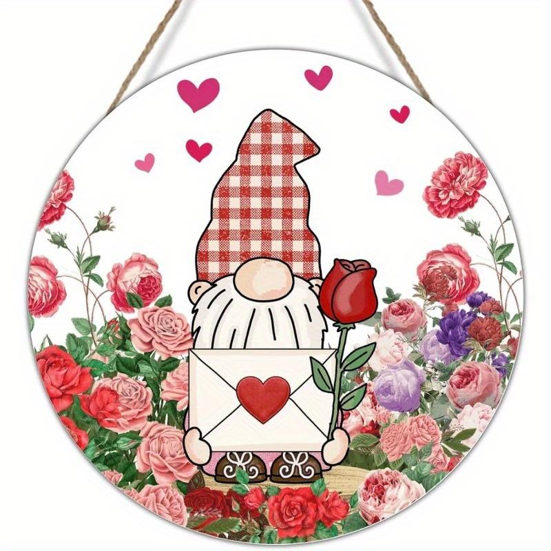 Знак на День святого Валентина с гномом и цветочным принтом «Любовь» из дерева, розовые и красные розы, цветочные гномы, деревенские знаки, 14 февраля, круглая дверная вешалка на День святого Валентина Wood
