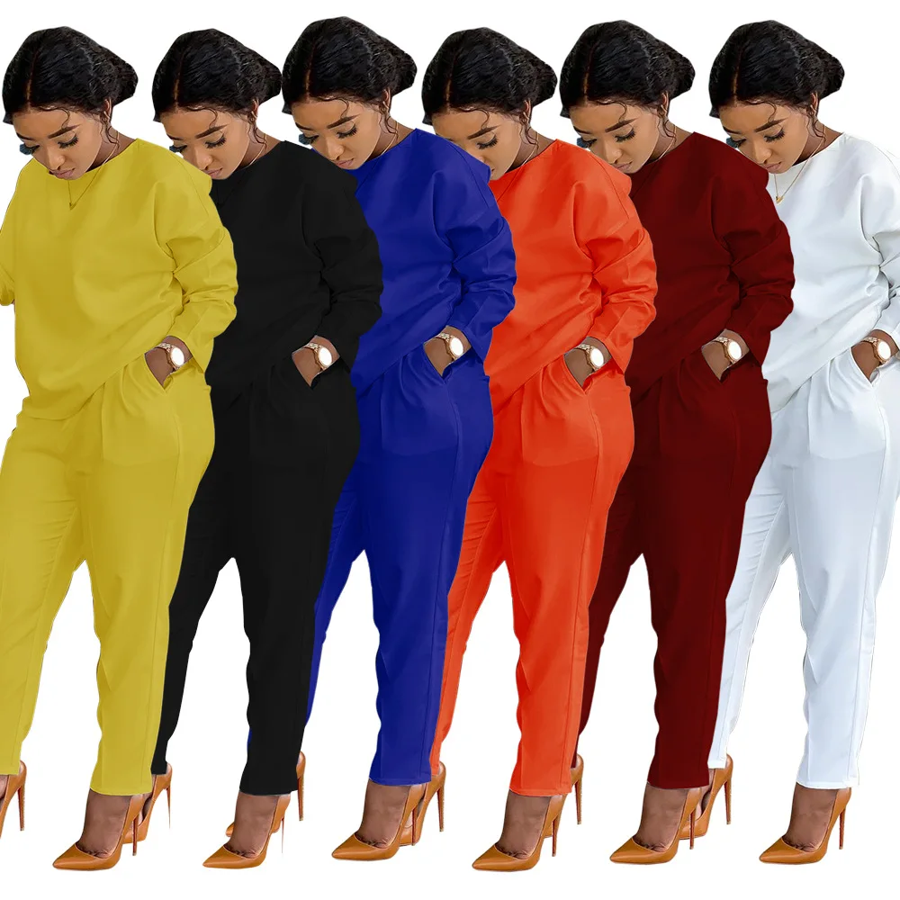 Casual Solid Color Two Piece Set Women Fall Clothes Round Collar Womens Clothing Two Piece Pants Set Women, White, yellow, black, blue, burgundy, orange