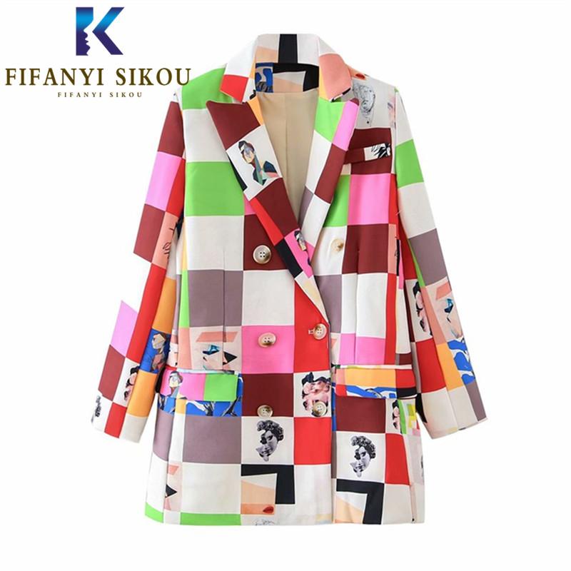 Pants 2020 Autumn Women Plaid Blazer Jacket Double Breasted Lapel Fashion Print Suit Jacket Streetwear Loose Womens Chic Blazers Coat, Style 2