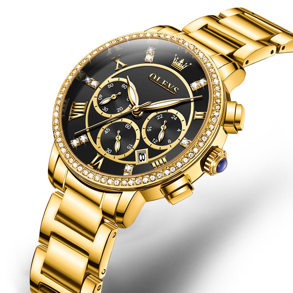 Золотые часы для женщин, роскошные, с календарем, неделей, светящиеся, многофункциональные, из нержавеющей стали, наручные часы, элегантные, кварцевые, женские часы с подарочной коробкой золотой/чёрный