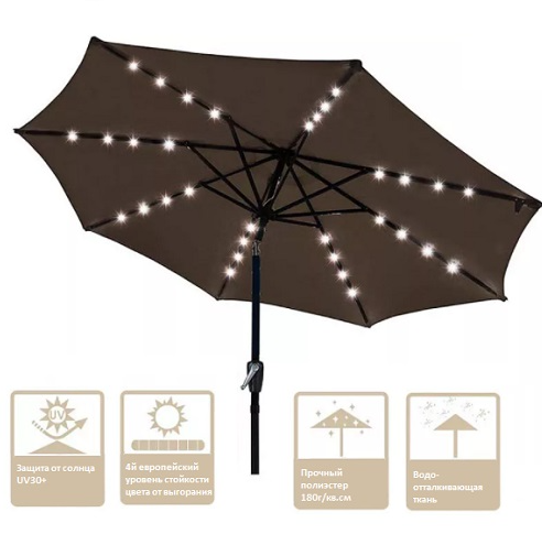 Особенно красиво такой зонт выглядит в вечернее и ночное время благодаря led-подсветке набирающей энергию от солнечной батареи