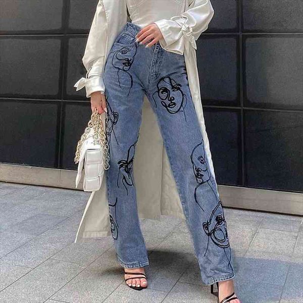 high waisted y2k abstract face women jean print blue pants streetwear loose casual straight baggy