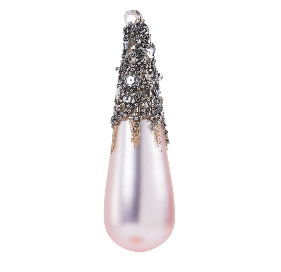 Игрушка для елки «Коллекция Традиции» Капля округлая матовая с бисером, цвет розовое серебро, 15 см, стекло, Великобритания